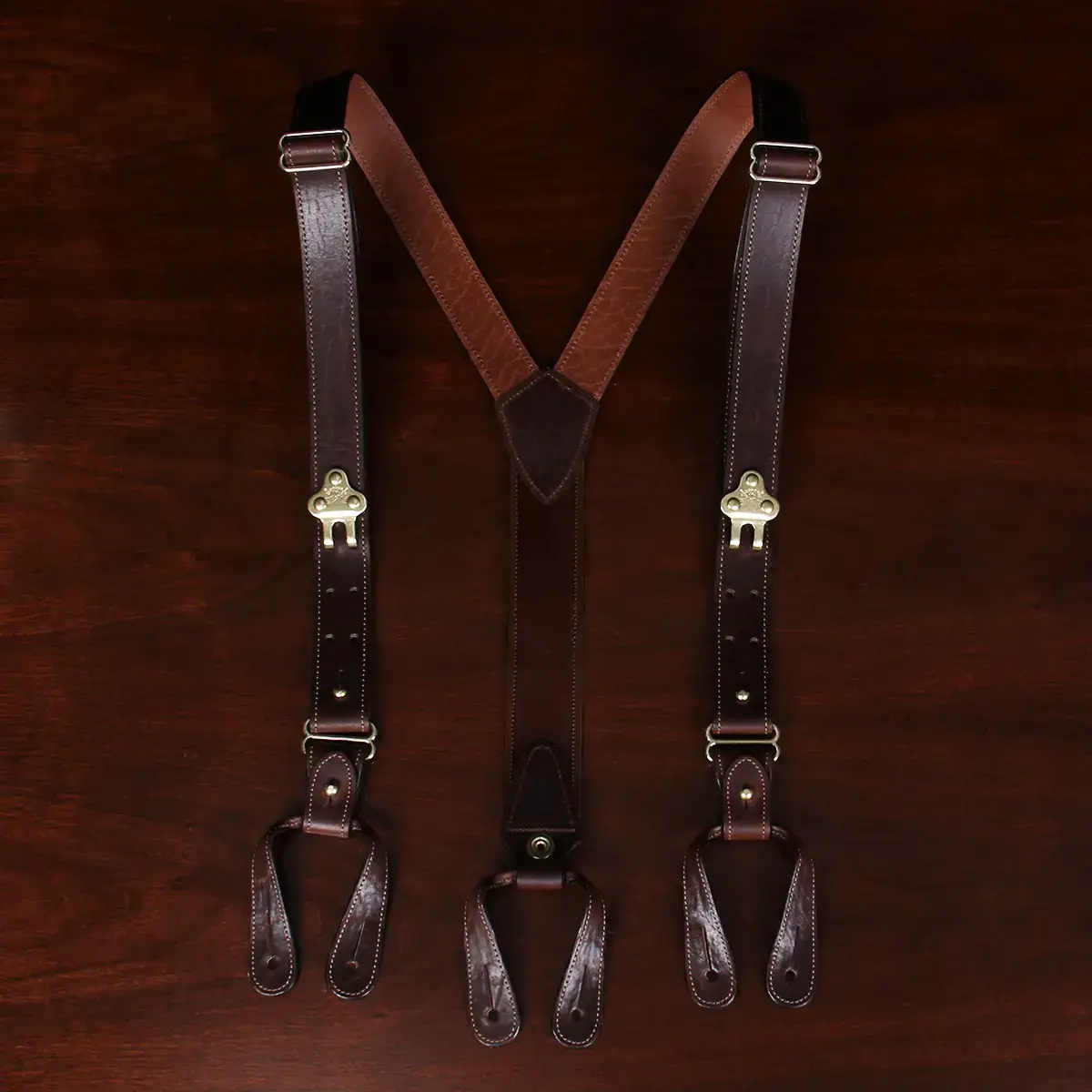 The natural character and uniqueness of deep, rich wonderfully-textured, full-grain, Tobacco Brown American Buffalo seems perfectly matched to the casual nature of these suspenders.