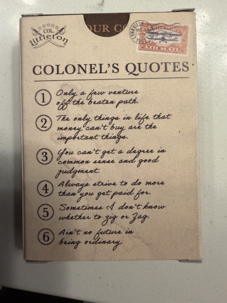 Colonel designed his cards with a vintage vibe using high-quality card stock with a linen-embossed finish. They are sized at 2 ½” x 3 ½” which is a common size. 54 cards per deck. The cards come packaged in a tuck-style box with a matte aqueous coating for durability. The card box has a collection of Colonel quotes on the back and a reminder of his three important things in life . . . Good Friends, Good Health and Peace of Mind . . . on the front.