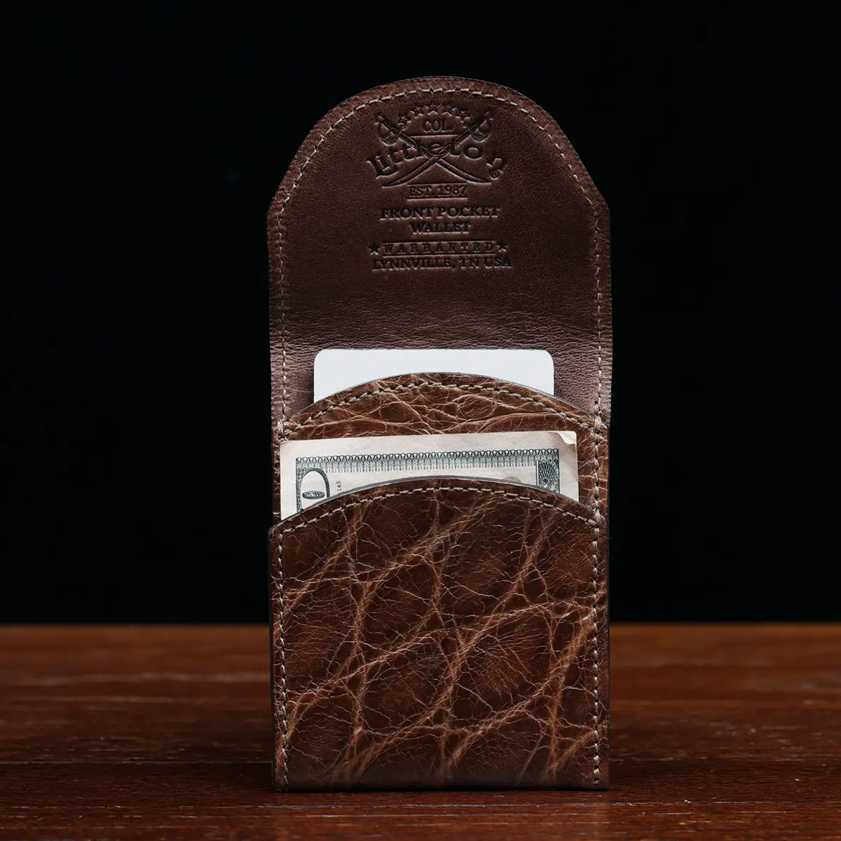 I didn’t know front pocket wallets existed until I saw them on the Colonel’s website. I had been carrying my bulky billfold in the front for years to avoid sitting on it. This one checks all the boxes for me: