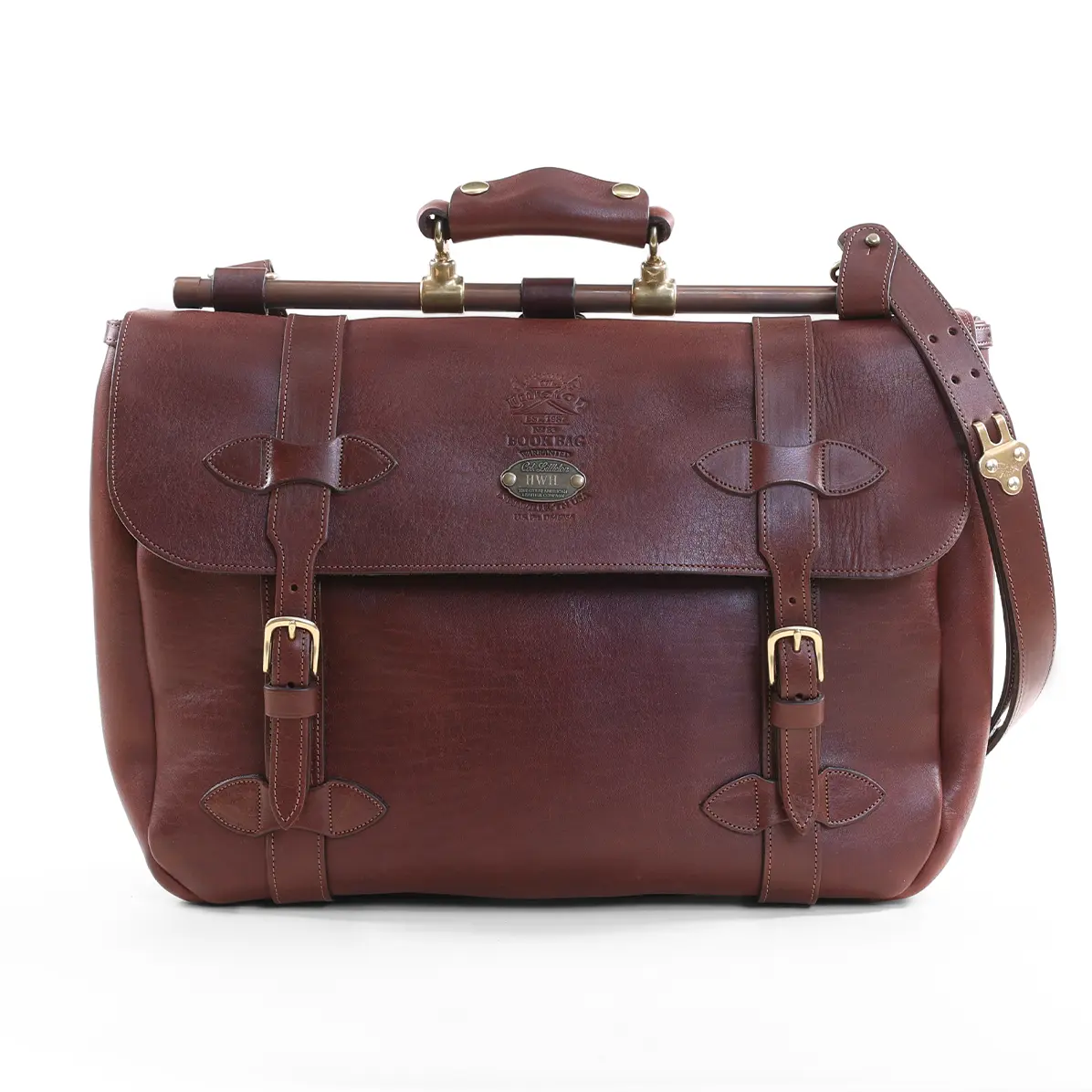 - Solid brass hardware, including serial-numbered ID plate under front flap