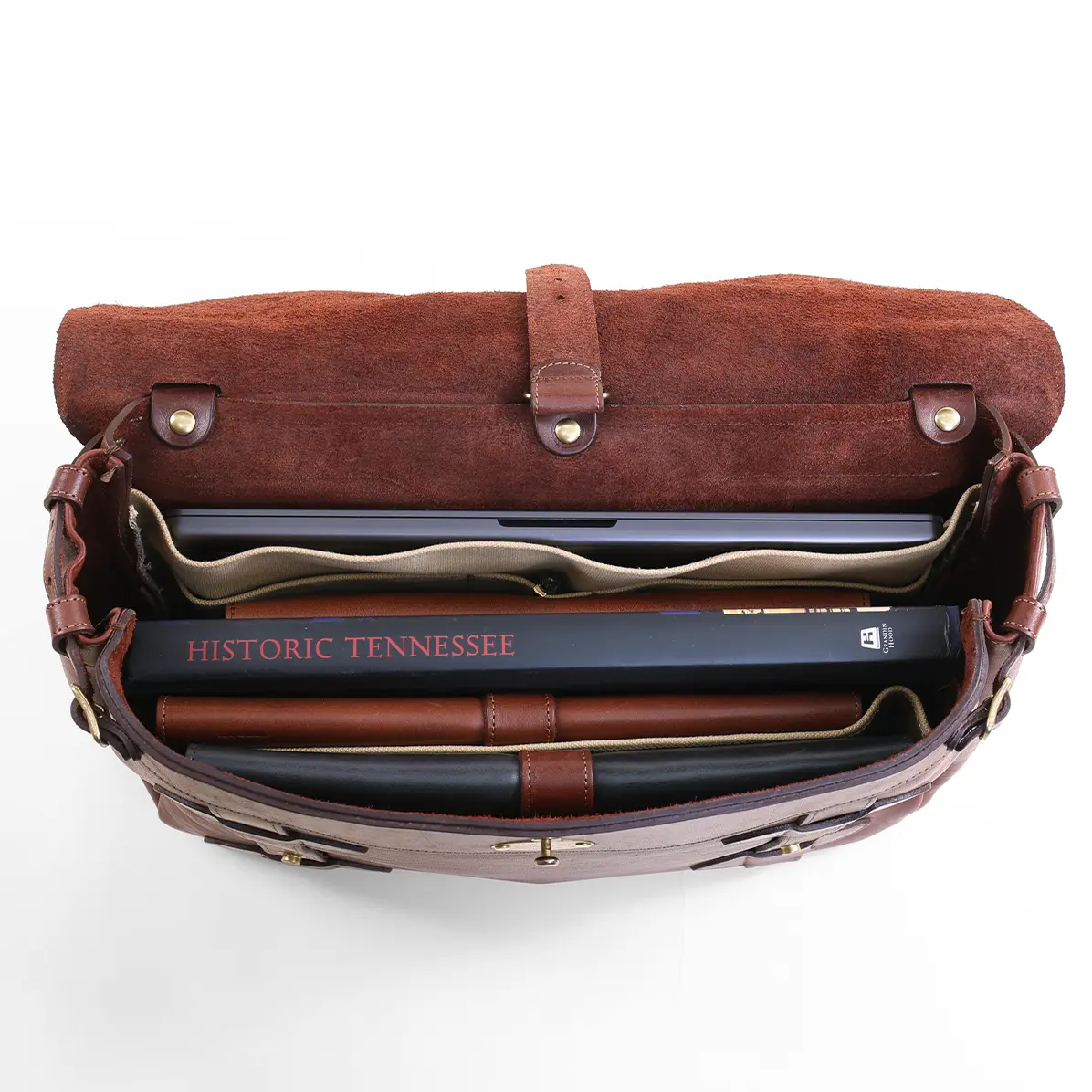 The Colonel thought of everything when it comes to the convenience and customization of this beautiful leather bag. An adjustable strap at the inside top enables you to adjust side panels in or out. The working buckle front closure can also be snapped for added convenience. A copper tube spine on top equally distributes the weight of the bag while accommodating the adjustable, removable shoulder strap and carrying handle. An inside divider separates your laptop from other contents, and there’s a special pocket for your iPad® or other tablet.