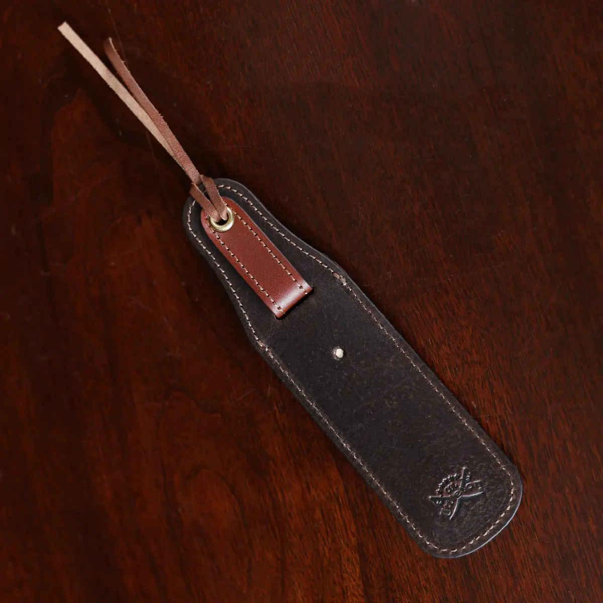 Made in the Col. Littleton Workshop of Tobacco Brown American Buffalo and lined in Calfskin, this bookmark sets the bar for beautiful bookmarks. Leather tassels loop through the brass eyelet to mark your place. May be personalized on the front with three initials. Comes in a cotton canvas drawstring bag with the Col. Littleton Logo.