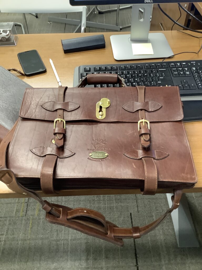 Perhaps the most exclusive feature of this incredible leather briefcase is the custom designed, solid brass closure – designed and manufactured by Colonel Littleton himself on a kick press from the 1800’s.