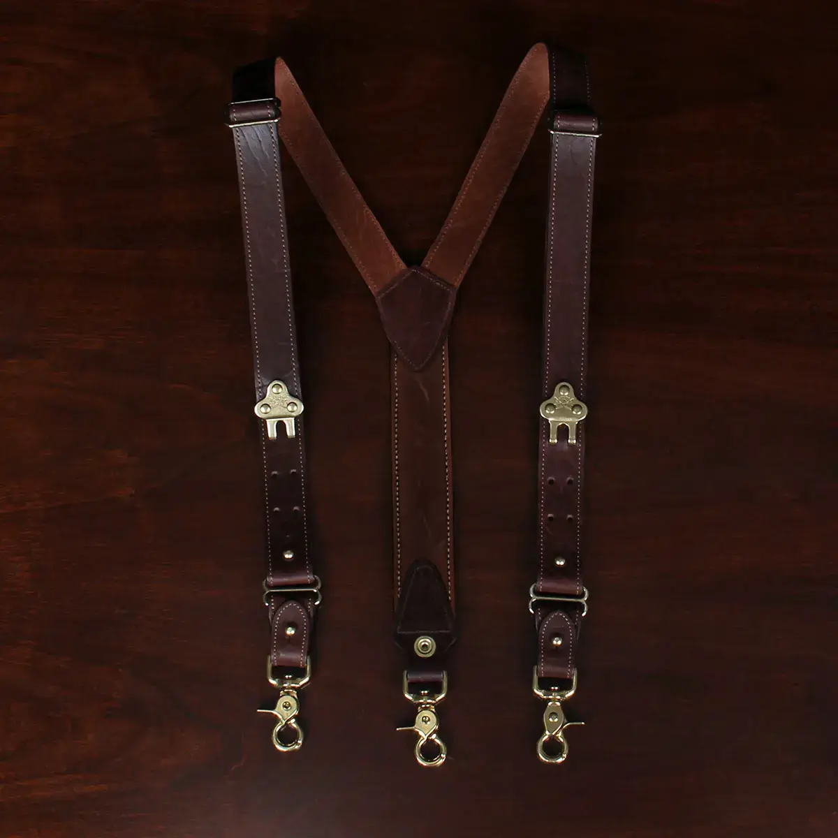 The natural character and uniqueness of deep, rich, wonderfully-textured, full-grain, Tobacco Brown American Buffalo seems perfectly matched to the casual nature of these suspenders.