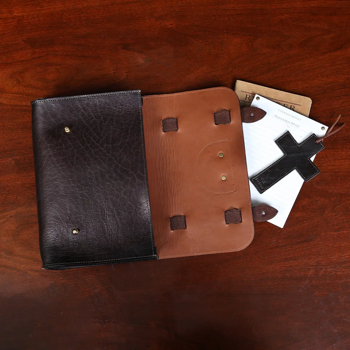 Superbly handcrafted in the Col. Littleton Workshop of our wonderfully-textured, full-grain, rich Tobacco Brown American Buffalo which is dry milled for a soft, lived-in look.  It just feels good in your hand. Trimmed in our traditional Vintage Brown Polished American Steerhide for a nice contrast. Two front straps with solid brass ball stud closures. To complete the look the No. 2 Bible Case is edge coated and edge stitched – hallmarks of quality construction – to give it durability and an aesthetically-pleasing finished look.