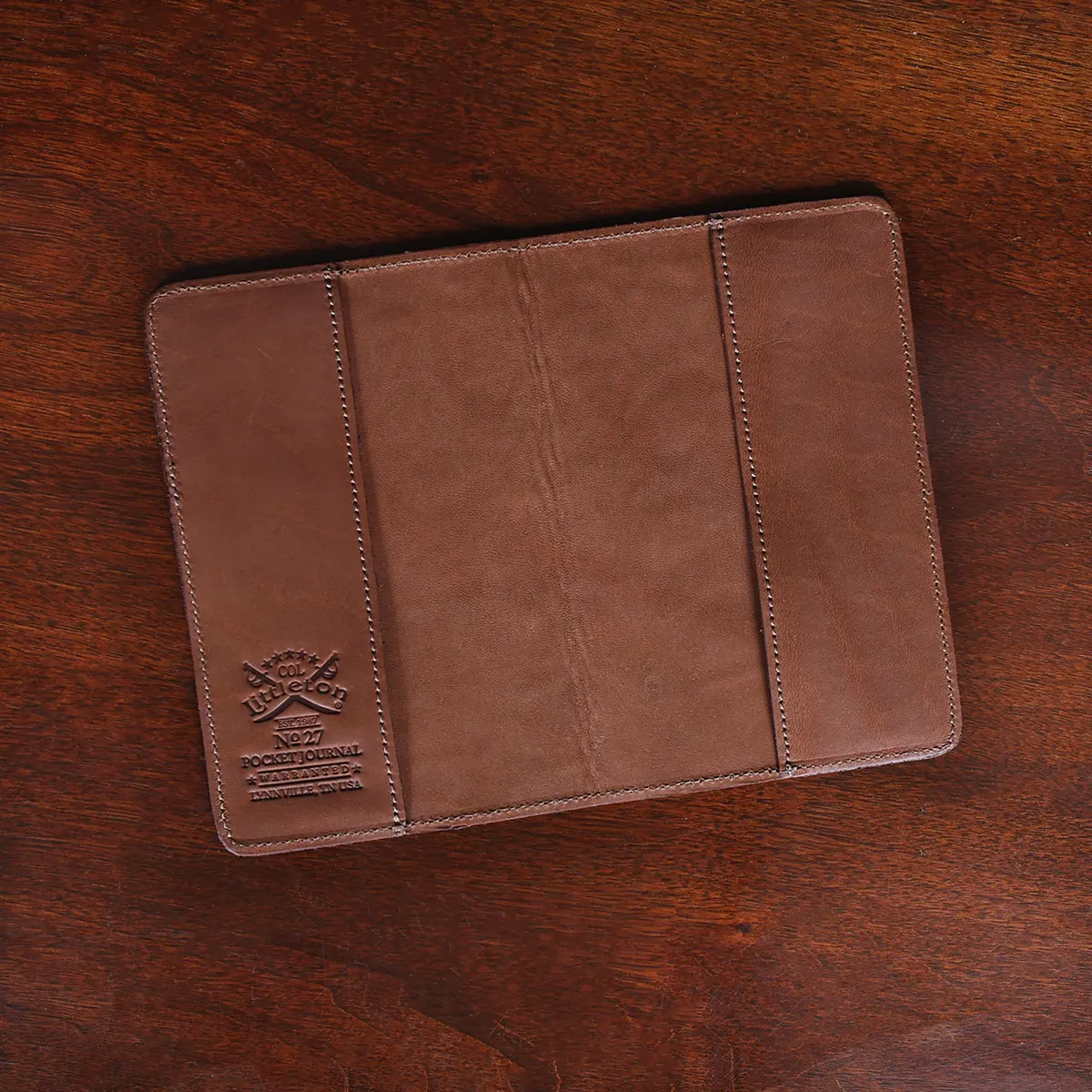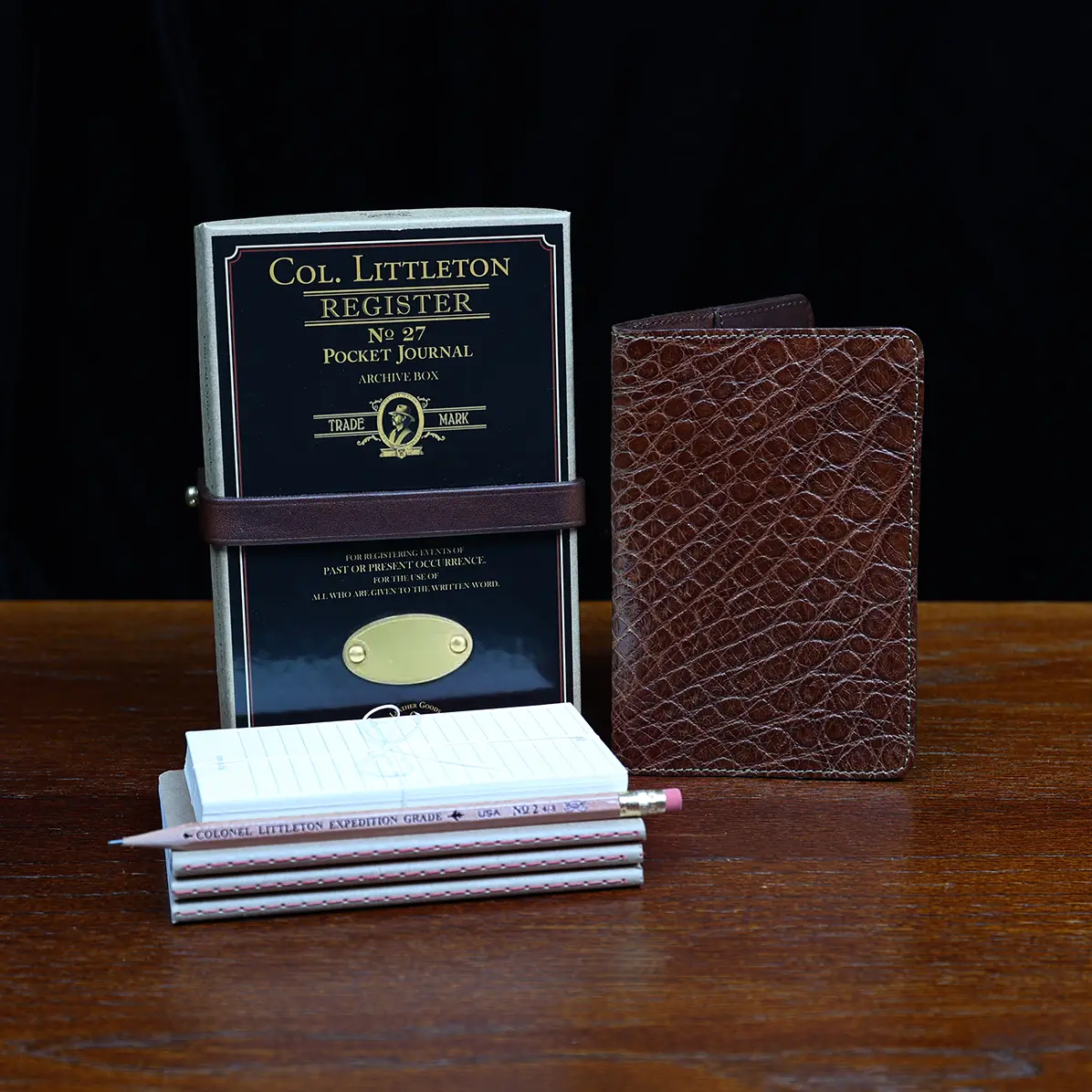 Leather journal cover, made in the Colonel Littleton Private Stock Workshop of luxurious authentic American Alligator with full American calfskin leather lining, fits our journal like a book cover. Also works with other journals of similar size. Use it today and preserve it for the ages.