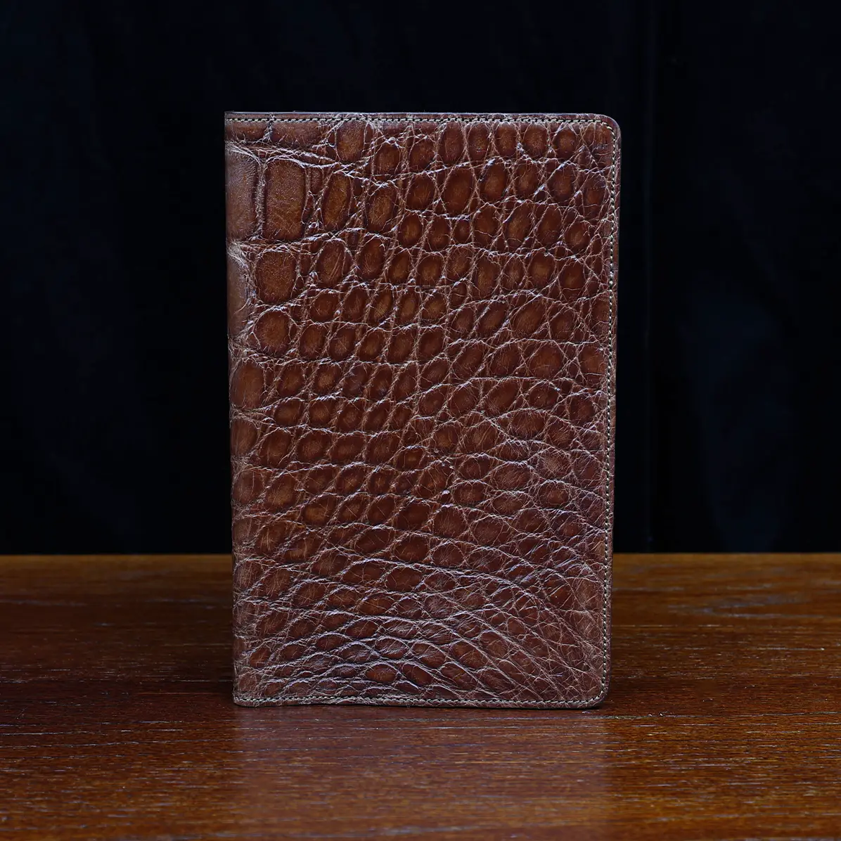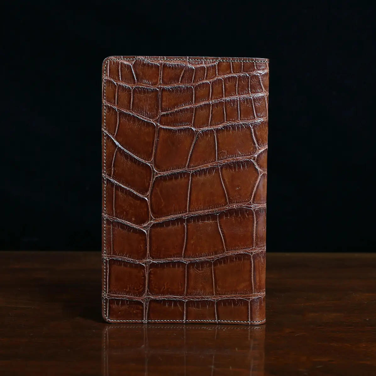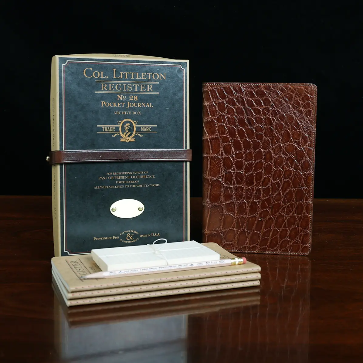 Leather journal cover, made in the Colonel Littleton Private Stock Workshop of luxurious American Alligator and fully lined in leather, fits our journal like a book cover. Also works with other journals of similar size. Use it today and preserve it for the ages. May be personalized with three initials and year engraved on archive box. Product packaging also includes a protective cotton canvas dust bag.