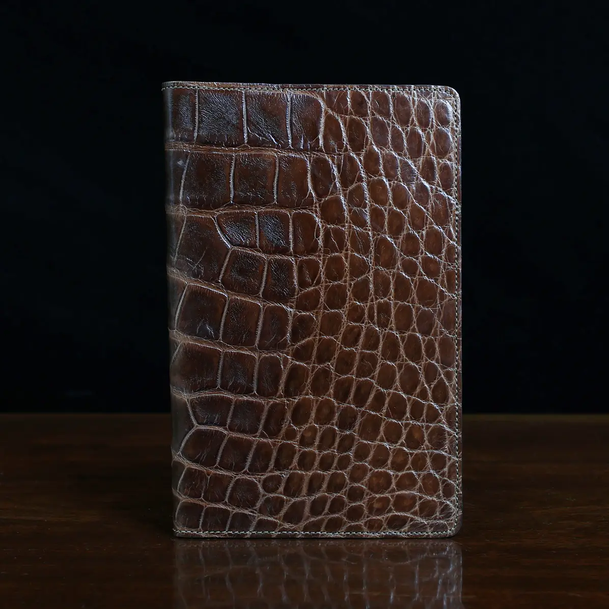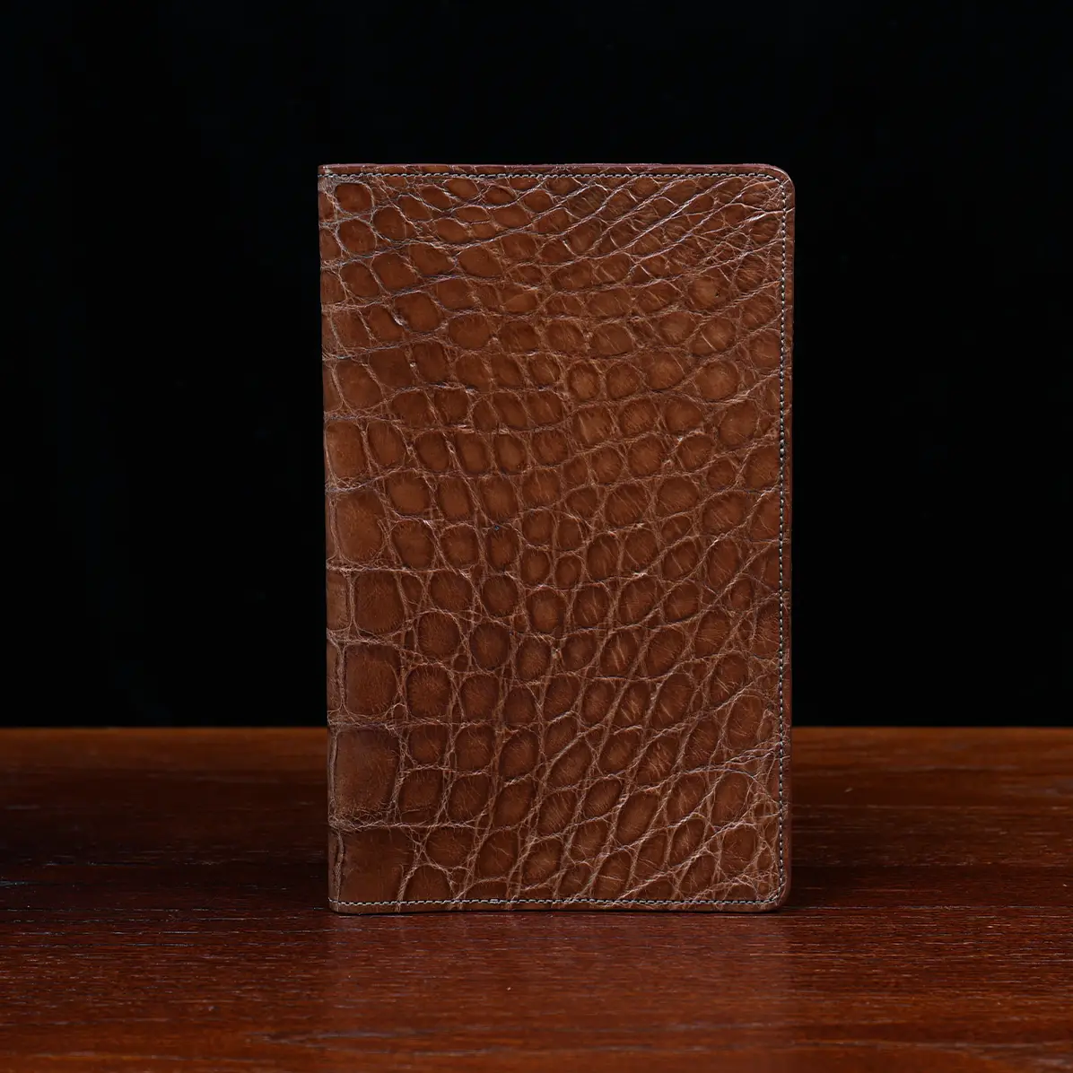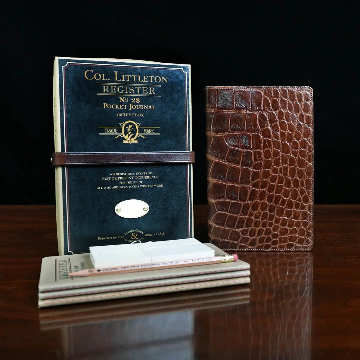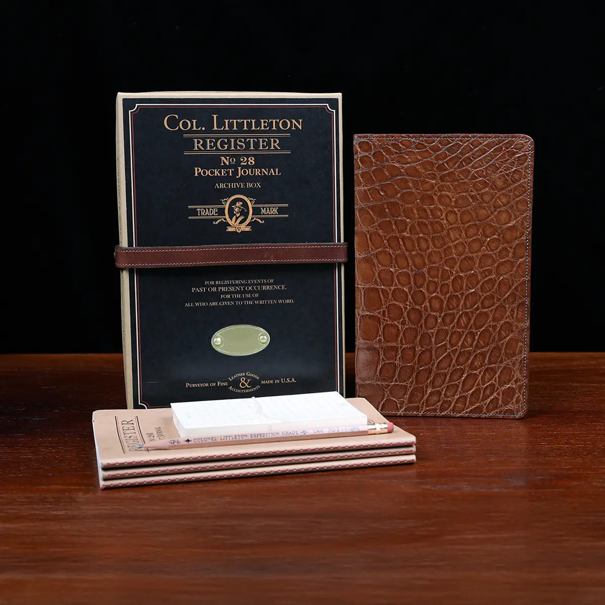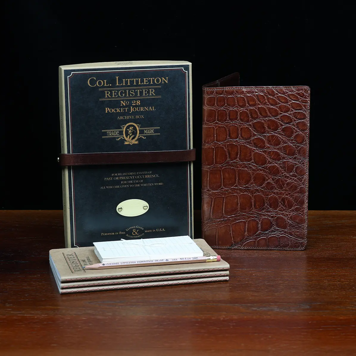 Leather journal cover, made in the Colonel Littleton Private Stock Workshop of luxurious American Alligator and fully lined in leather, fits our journal like a book cover. Also works with other journals of similar size. Use it today and preserve it for the ages. May be personalized with three initials and year engraved on archive box. Product packaging also includes a protective cotton canvas dust bag.