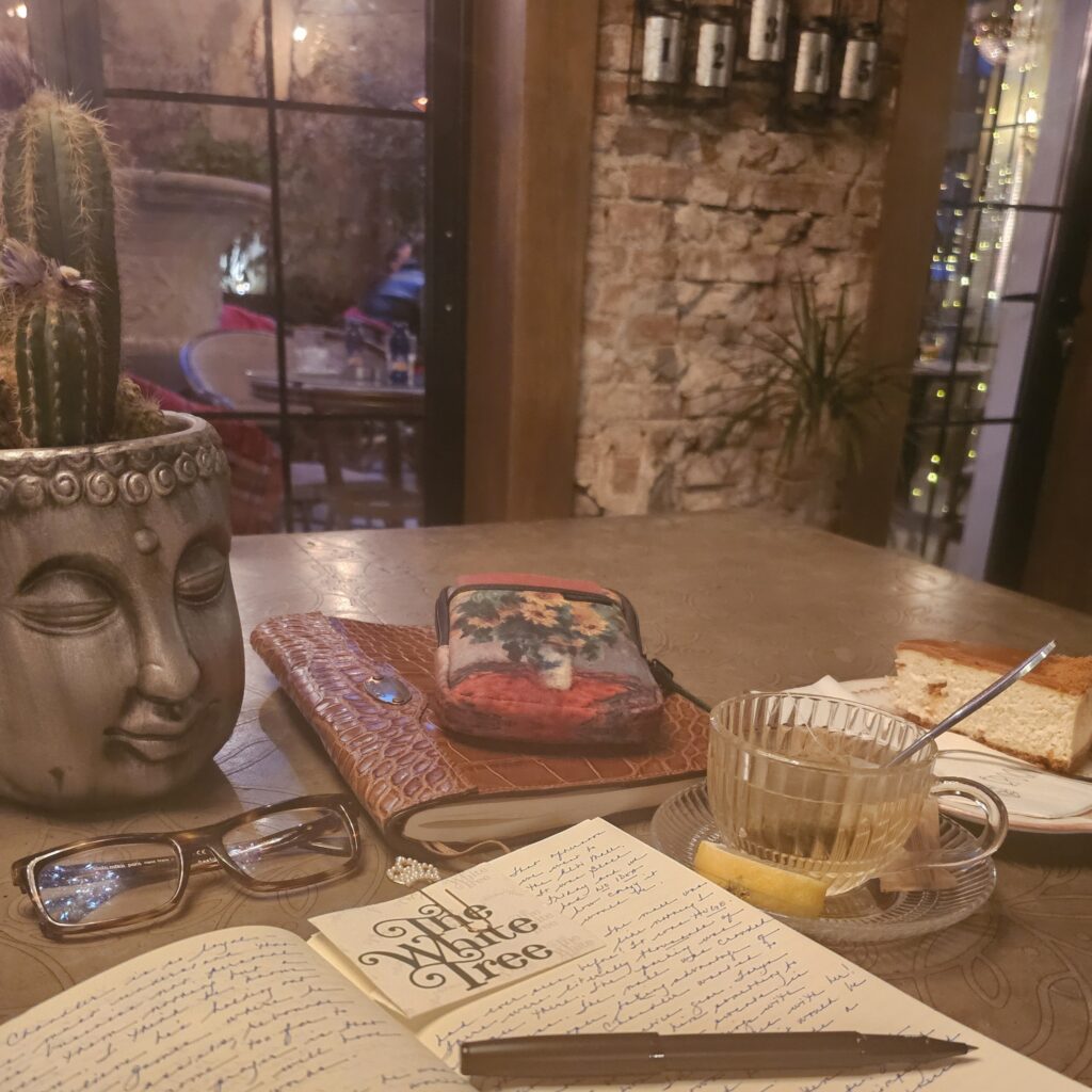 While traveling in Kosovo this week, I happened upon Epoque, a beautiful cafe in Pristhina. I was drawn in by the store front — a narrow garden pathway with trees and shrubs adorned with holiday string lights. I loved to vibe. As I entered the cafe, Bossanova music was playing in the background, people were gathered together enjoying good each other over coffee. It was perfect setting for jounaling. I ordered tea and Albanian cheesecake and settled in to write with my favorite American Alligator Journal from Col Littleton. It is simply stunning! It feels great in my hand – soft, pliable alligator leather with card pockets to keep business cards and notes. I love traveling with this heirloom quality piece. I always get compliments. It is so ridiculously gorgeous, I caved bought the No 41 commander briefcase – American alligator and American buffalo. It is perfectly matched. I’ll be writing a separate review on the briefcase. I have ZERO regrets on spending this much money this purchase. As the Col says, ‘We in the wantin’ business.’