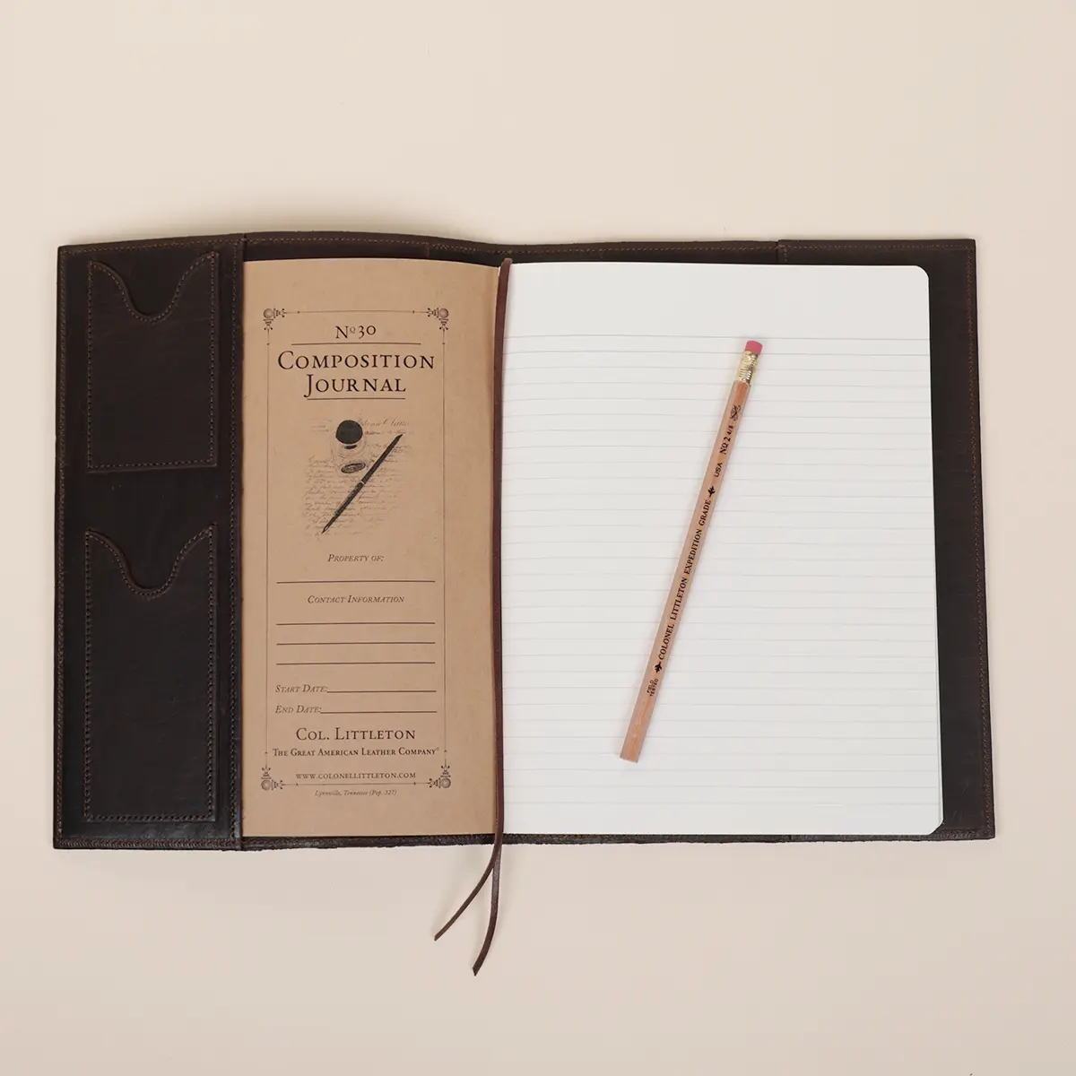 Colonel’s Journal Register (9 ¾” (H) x 7 ⅜” (W)), which may be reordered, contains 160 ruled and center-stitched pages (80 sheets). Opens flat so you can write on both sides of the paper. Date the registers on the inside cover, file them away and you have a chronicle of your daily activity and a treasure for future generations – your life story as told by you. Standard composition notebooks also work well with our journal cover.