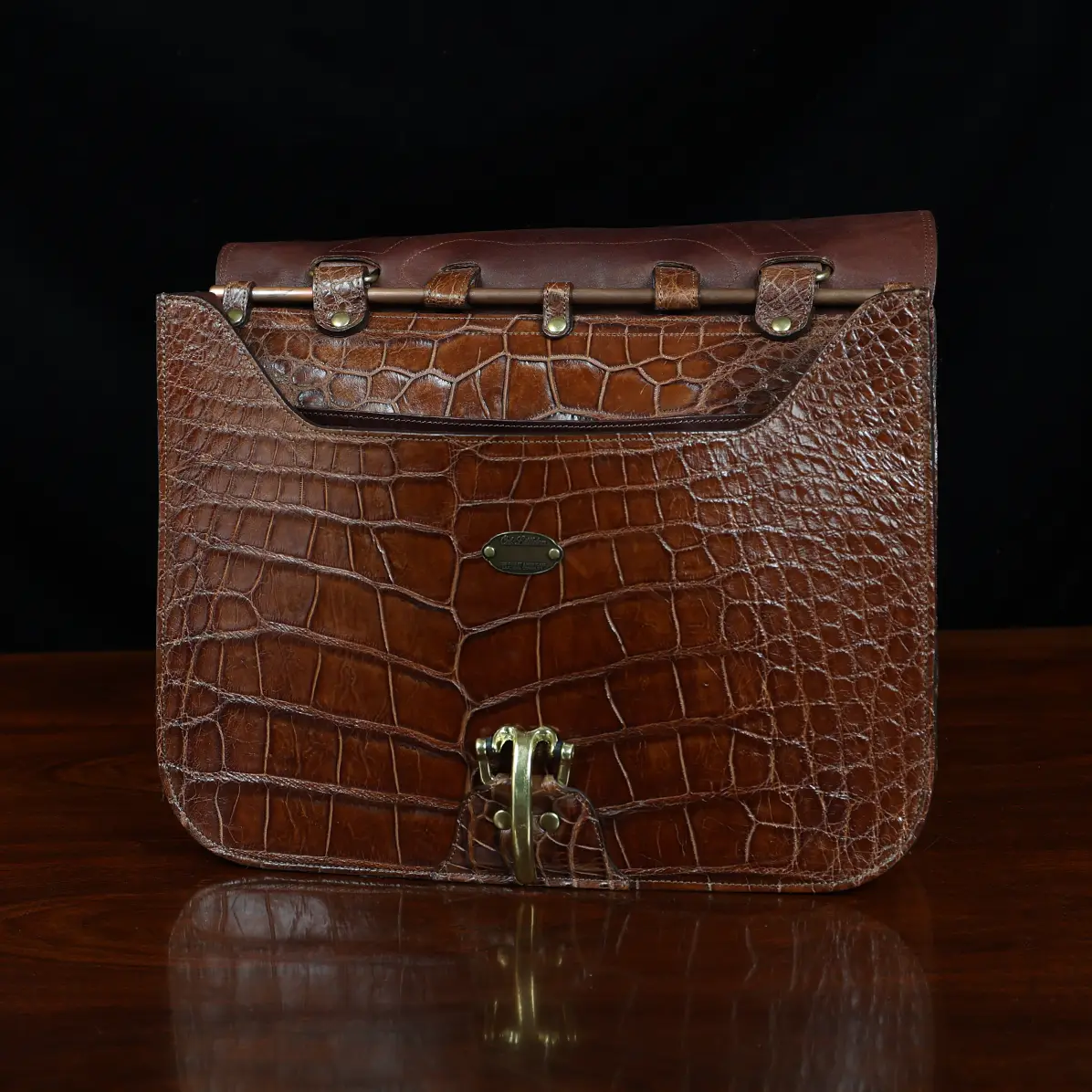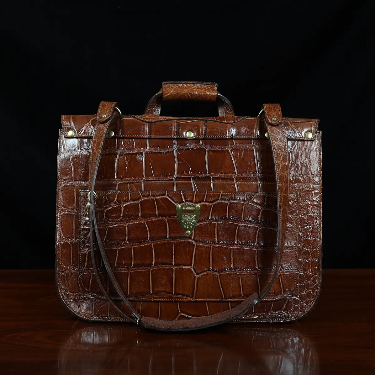 This No. 41 Commander Briefcase is truly a custom, handcrafted piece of superior quality and timeless beauty that exudes luxury and authority. This roomy laptop bag was handmade in the Col. Littleton Workshop in Lynnville TN, USA from authentic wild American Alligator hides. Colonel personally selected and matched the hides used to make this bag and supervised every step of its construction. You will seldom, if ever, have another opportunity to carry a briefcase as fine as this one.