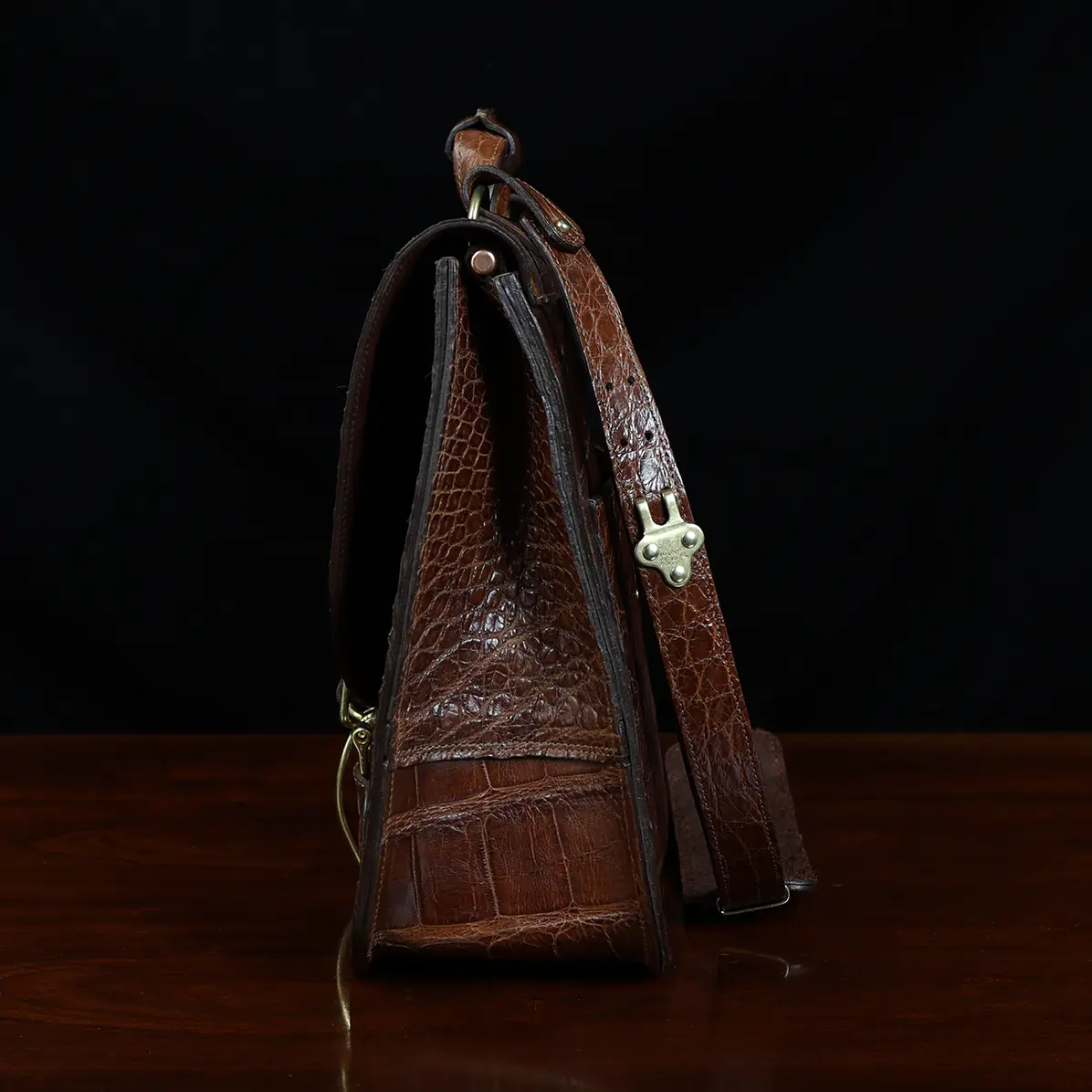 The hides we use are from alligators raised and trapped in the wild. Each hide is intentionally chosen to show the natural character markings such as scars and scratches that are common to alligators raised in the wild. The straps on this bag are made from sections of American Alligator. Learn more about our American Alligator