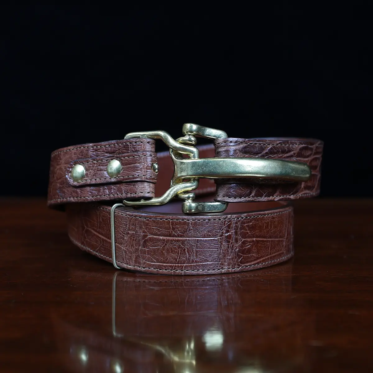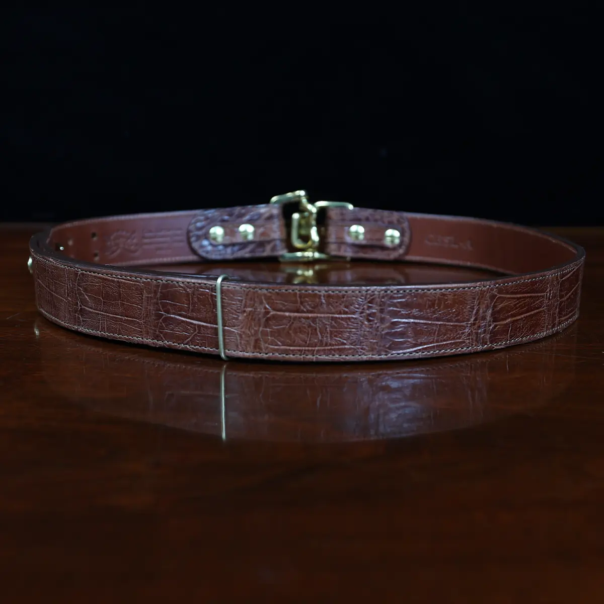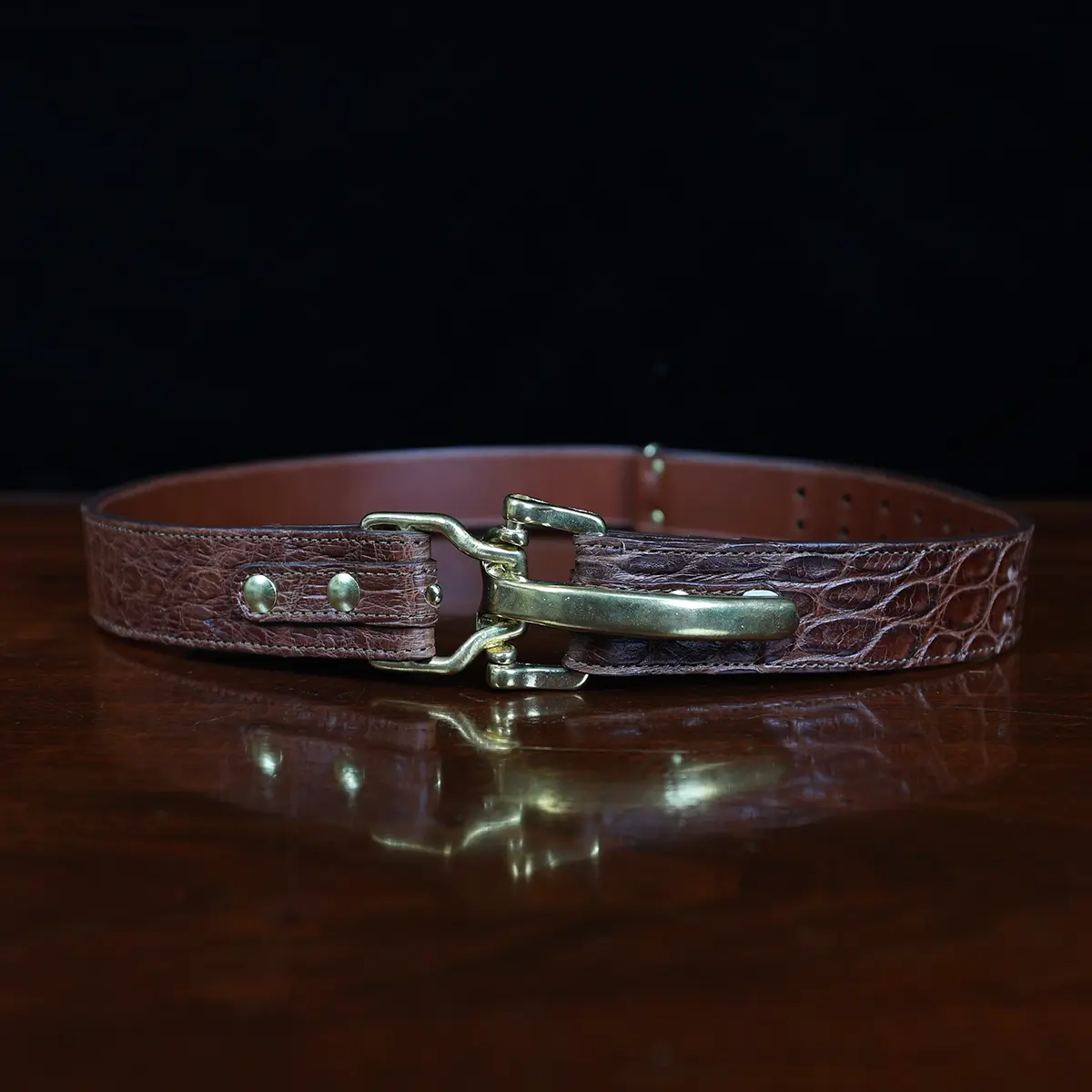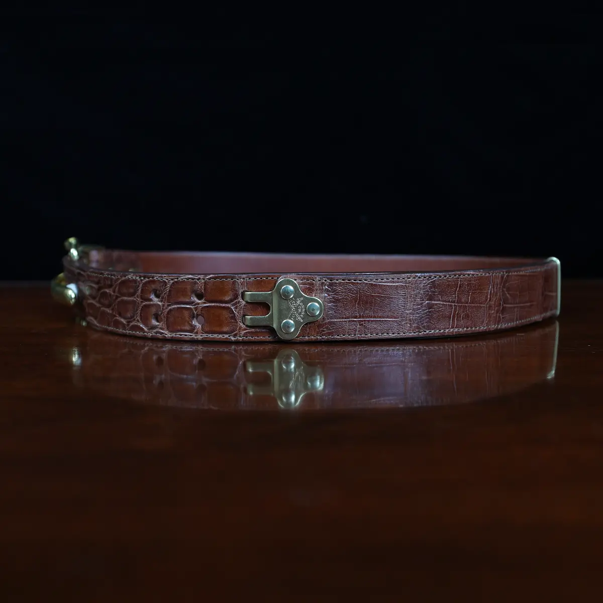 Equally attractive with jeans or khakis, the belt is made of brown American Alligator, features solid brass hardware and is handmade in the Col. Littleton Workshop. 1 3/8″ wide. (Note: Requires a 2″ belt loop to accommodate buckle hardware.) Product packaging includes a protective cotton canvas dust bag and gift box.