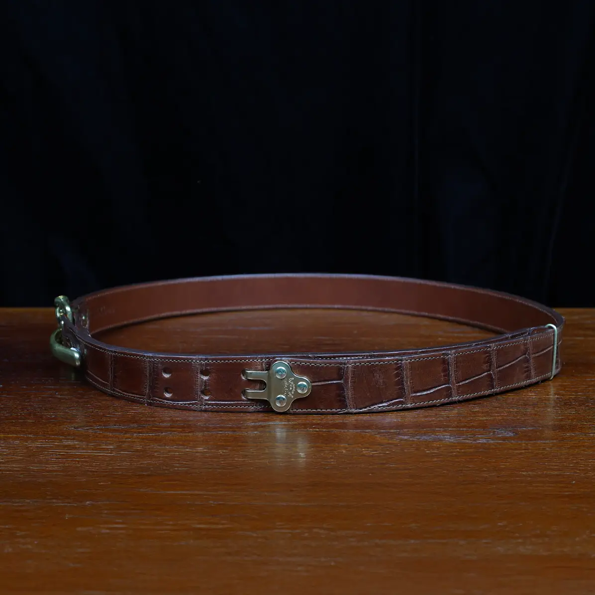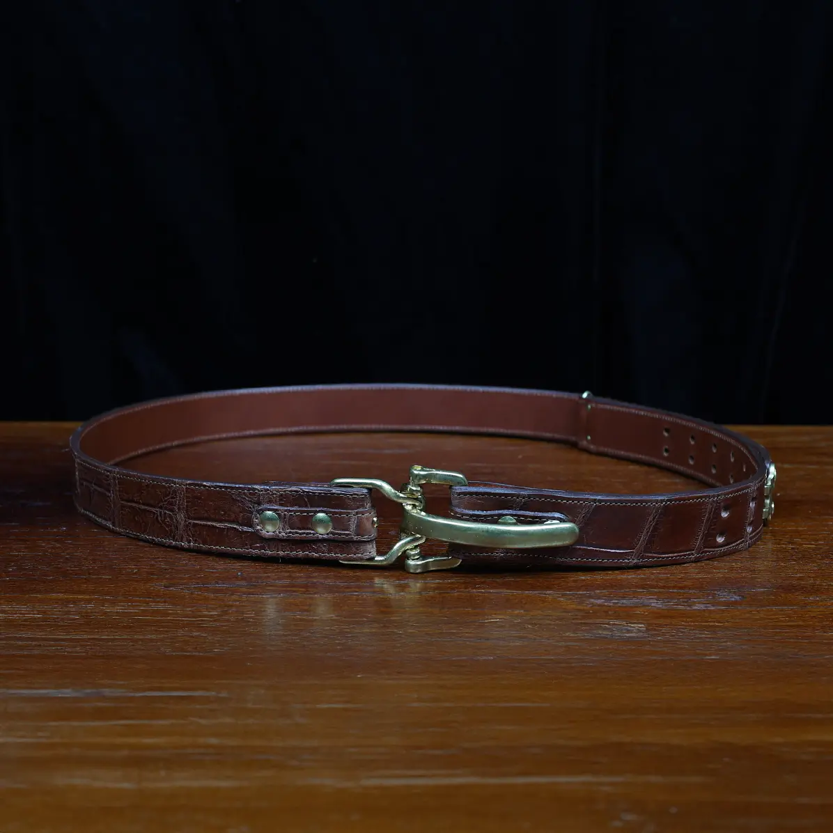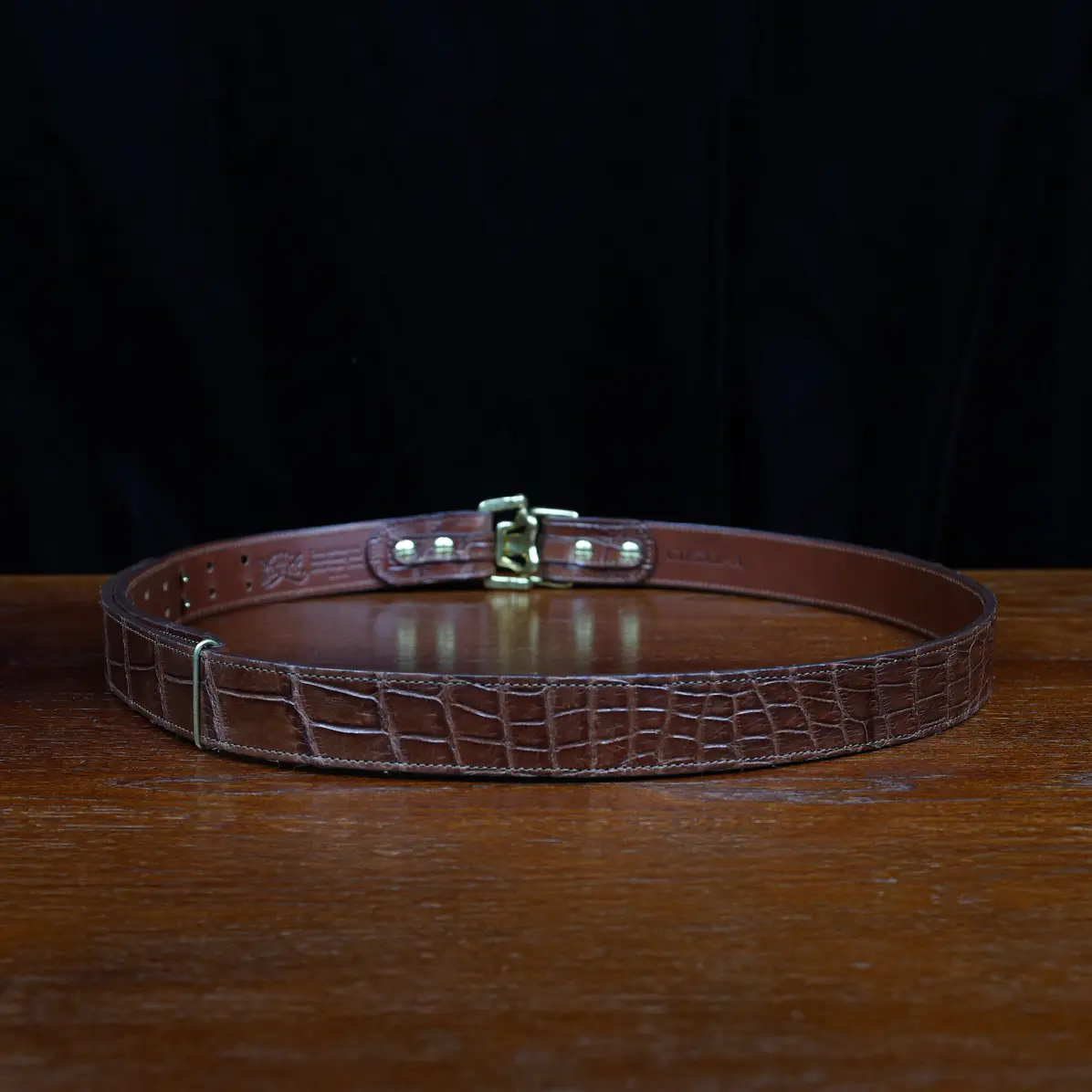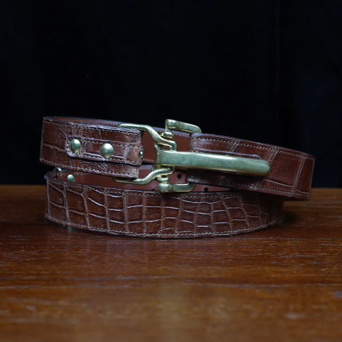 Equally attractive with jeans or khakis, the belt is made of brown American Alligator, features solid brass hardware and is handmade in the Col. Littleton Workshop. 1 3/8″ wide. (Note: Requires a 2″ belt loop to accommodate buckle hardware.) Product packaging includes a protective cotton canvas dust bag and gift box.