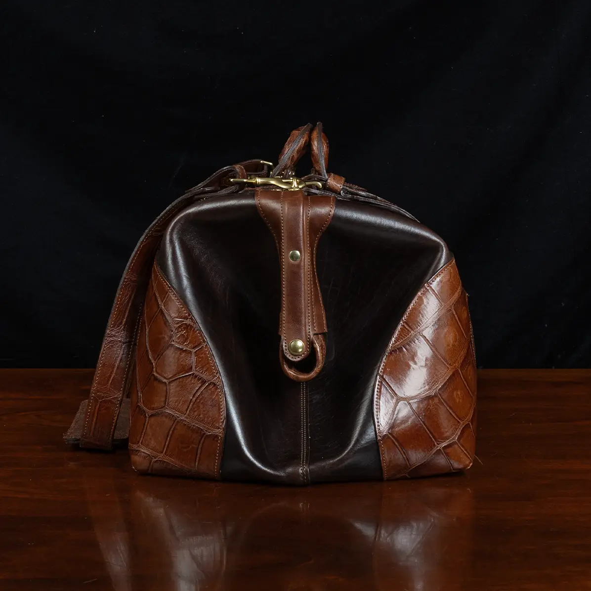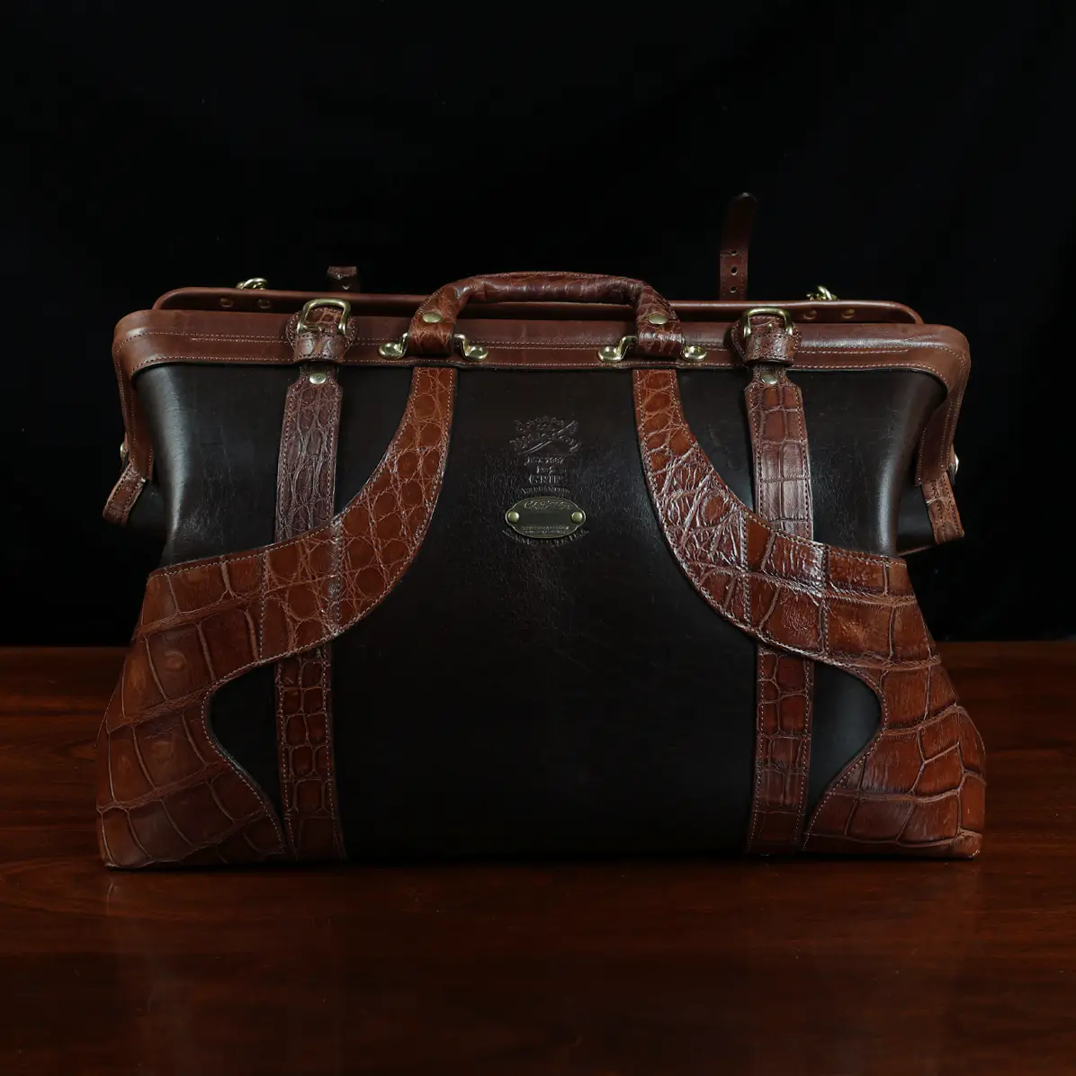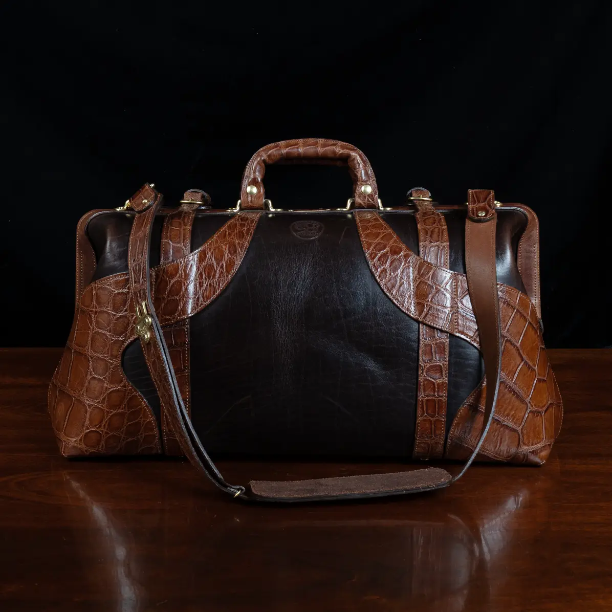Colonel is passionate about American Alligator. He personally cut and matched all of the alligator trim on this bag. The carry strap is made of alligator, as well as the handles and closure straps that encircle the bag.