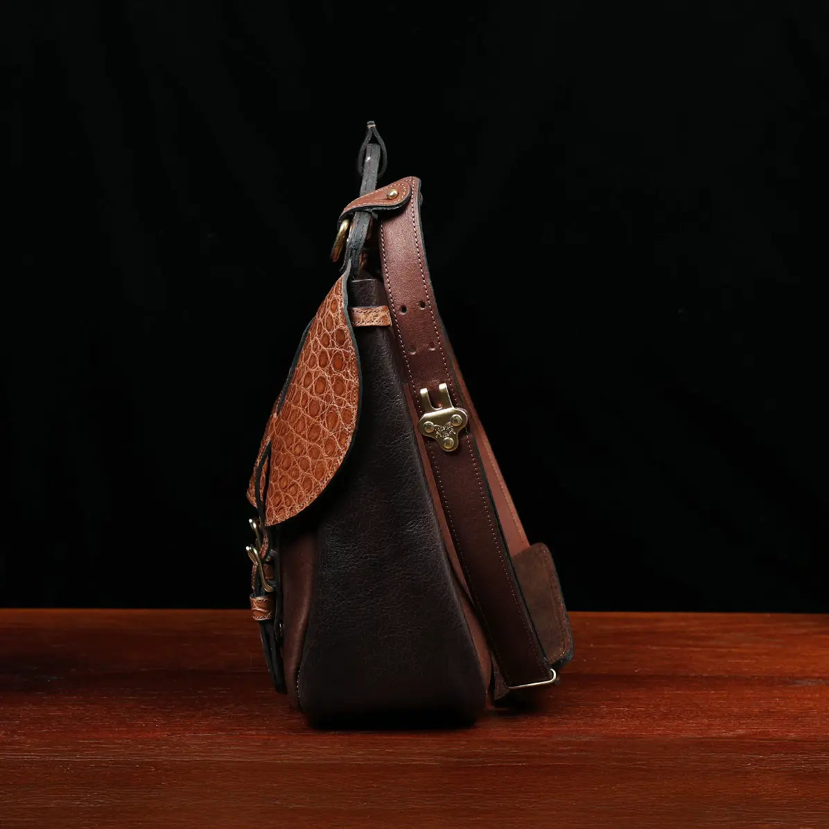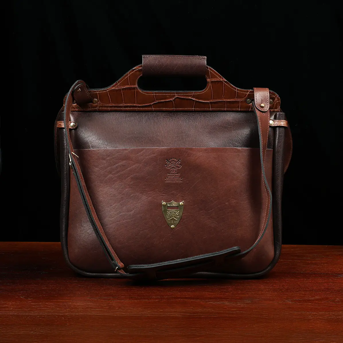 American Alligator bags have always been considered luxury items and this business bag made in complementing leathers of American Alligator and Tobacco Brown American Buffalo is proof that the addition of alligator elevates the look and luxury of a bag. The design is reminiscent of the saddlebags carried by the U. S. Cavalry from the 1850’s, is contemporary enough for today’s busy executive who likes something different. Front straps with workable buckles also have snap closures behind the buckles for quick access. Inside front and back leather dividers with pockets for pen, business cards, cell phone, calculator, etc. Outside back pocket and adjustable shoulder strap with pad feature vegetable-tanned American Steerhide. Brass D-ring provides a good place for attaching one of our brass luggage tags.